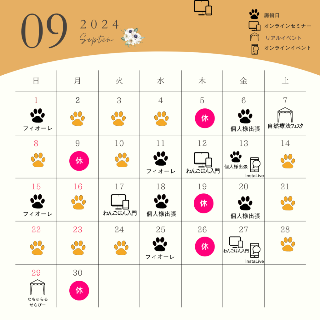 もう9月半ばとなってしまいましたが9月と10月のイベントのお知らせです。【9月】施術会 寝屋川会場(カフェフィオーレ様)15日、25日 萱島会場(花の庵 自宅サロン) 16日、21日~24日、28日イベント わんこと楽しむなちゅらるせらぴー 29日オンラ...